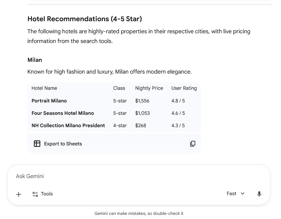 Additionally, use AI to find the best deals on travel and lodging for your trip. While you can theoretically use any AI platform to do this, MIT Technology Review suggests using Google Gemini if you have a Google account. This platform integrates Google Flights and Google Hotels into its system and pulls real-time information from Google’s partner companies. This subsequently makes it easy to compare prices, accommodations and travel times to find the best deals. Plus, you can also export the information to Google Sheets for reference.